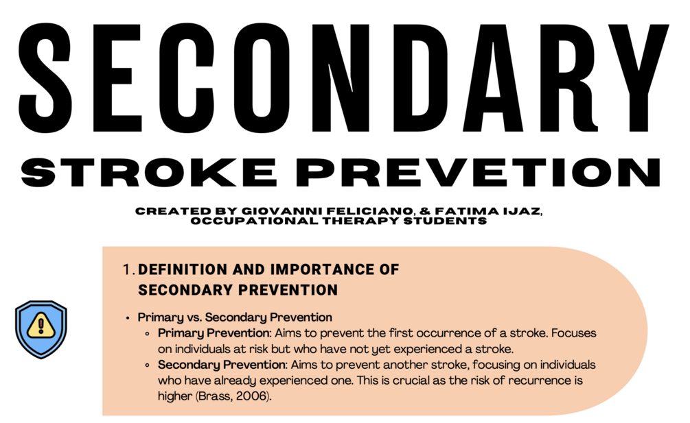Healthcare Professionals: Client education is key as part of our professional practices. Share this infographic with clients to help them understand how to prevent secondary stroke. Developed by D'Youville University OT students, Giovanni Feliciano and Fatima Ijaz for your use.